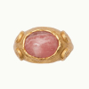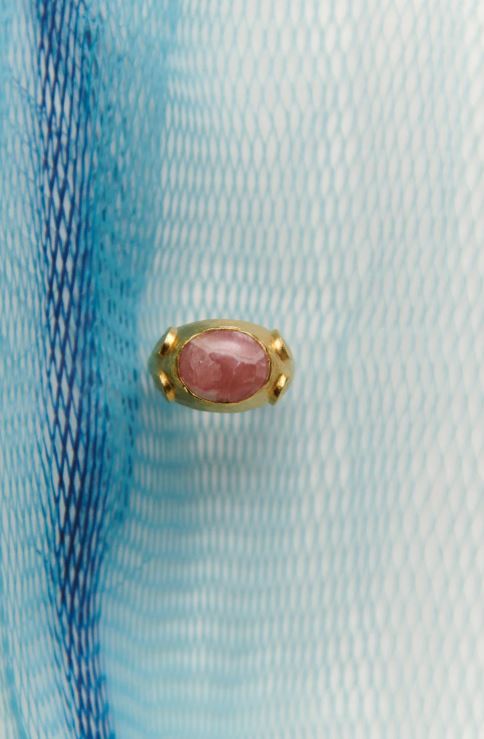 Persia es un anillo inspirado en la joyería de la época clásica. En su centro, una piedra Rodocrosita rosa protagoniza el diseño, asociada al amor, la sensibilidad y la conexión emocional. A ambos lados, las volutas esculpidas en el metal evocan los ornamentos de la joyería persa y clásica, aportando movimiento y armonía a la pieza.