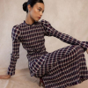 Su diseño incorpora un cuerpo fruncido tipo nido de abeja, que se adapta a la silueta realzando la figura de manera cómoda. Las mangas largas abullonadas con puño fruncido y volante aportan volumen y un aire romántico, mientras que el bajo con vuelo ligero suma movimiento y dinamismo.
