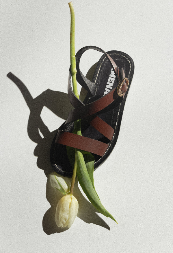 Damiana es un modelo que destaca por su comodidad y versatilidad. Sencilla y práctica, Damiana cuenta con dos tiras que se cruzan en el empeine recogiendo el tobillo para una mejor sujeción y comodidad al caminar. Lleva un cerco grabado en la suela de cuero. La sandalia cierra con una de las hebillas más características de JIMENAS, que cuenta con un delicado trabajo de tachas y gotas.