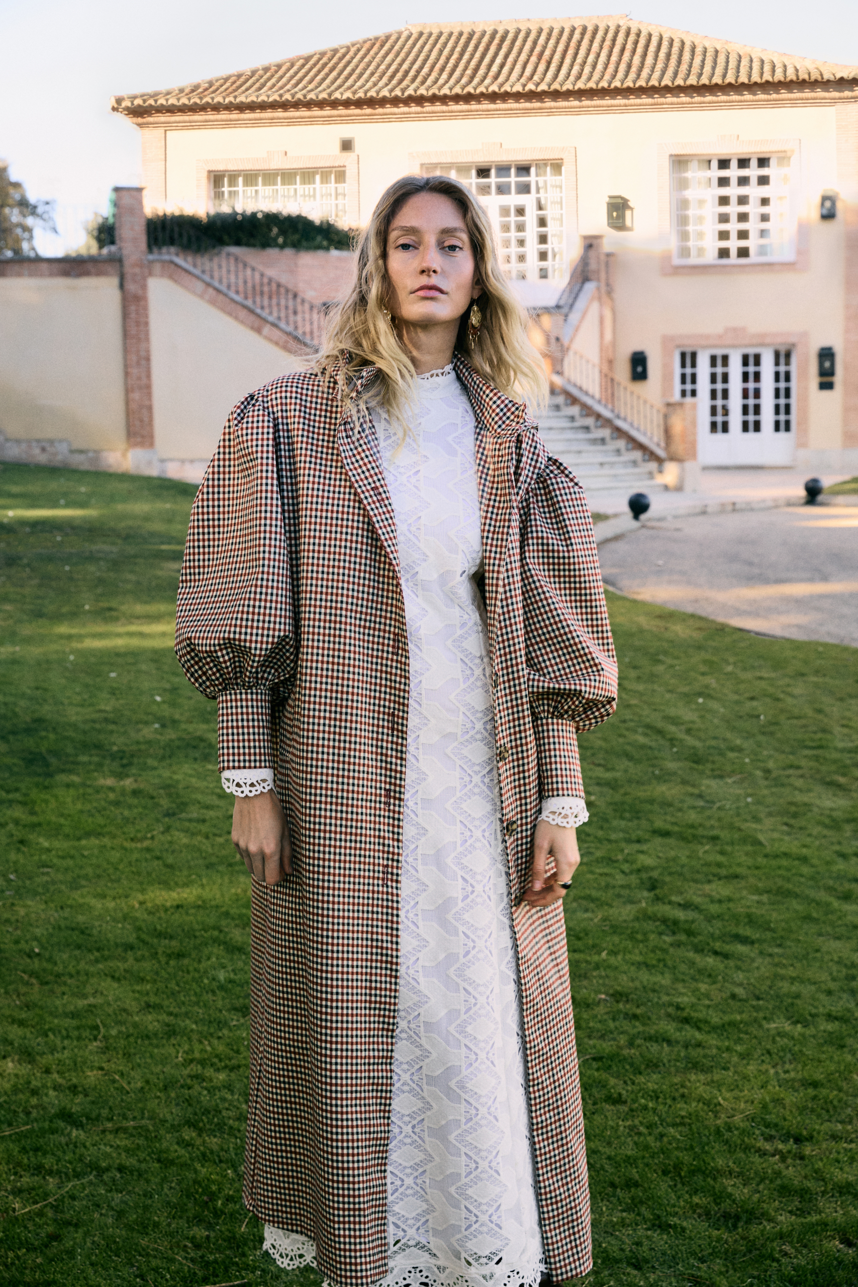 Un básico en tu armario de transición, Mat es un trench realizado en loneta en estampado a cuadros. Sus mangas abullonadas con puños amplios la convierten en una silueta única.