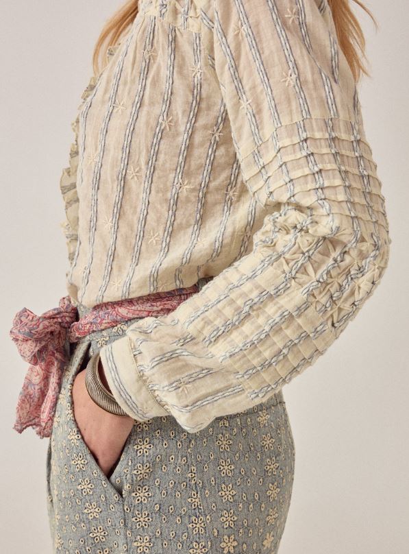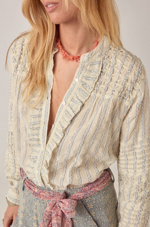 Blusa de manga larga en algodón. Cuello con botones y volantes a lo largo de la botonadura. Inserciones de encaje y finas costuras. Mangas largas con volumen y caída fluida. Corte holgado y natural.