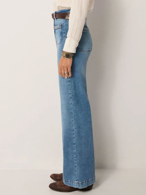 El pantalón Giuletta, confeccionado en denim de algodón lavado, presenta un ajuste de tiro alto con un suave vuelo para una silueta favorecedora.