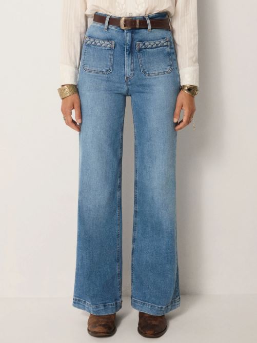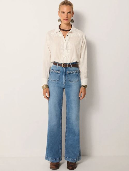 Su tono índigo claro aporta frescura y es versátil para blusas estructuradas o prendas de punto informales. Los detalles trenzados en los bolsillos le aportan un toque artesanal.