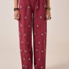 El color Rojo Mar es burdeos intenso, cálido y rico. Sutiles rayas tejidas y bordados recorren la pierna, haciendo referencia a los textiles beduinos. De corte relajado pero femenino, cae suavemente con movimiento y ritmo.