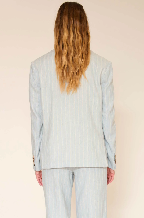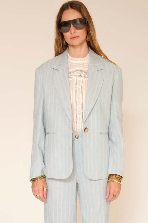 Con sus finas rayas y su luminoso tono, la chaqueta Volcy reinventa el traje sastre con una elegancia suave y contemporánea. Su corte recto y estructurado estiliza la figura a la vez que resulta cómodo, lo que la hace ideal para el día a día o para un look más formal. Llévala sola o como parte de un conjunto completo con los pantalones a juego, aportando un toque chic y fresco a todos tus looks.