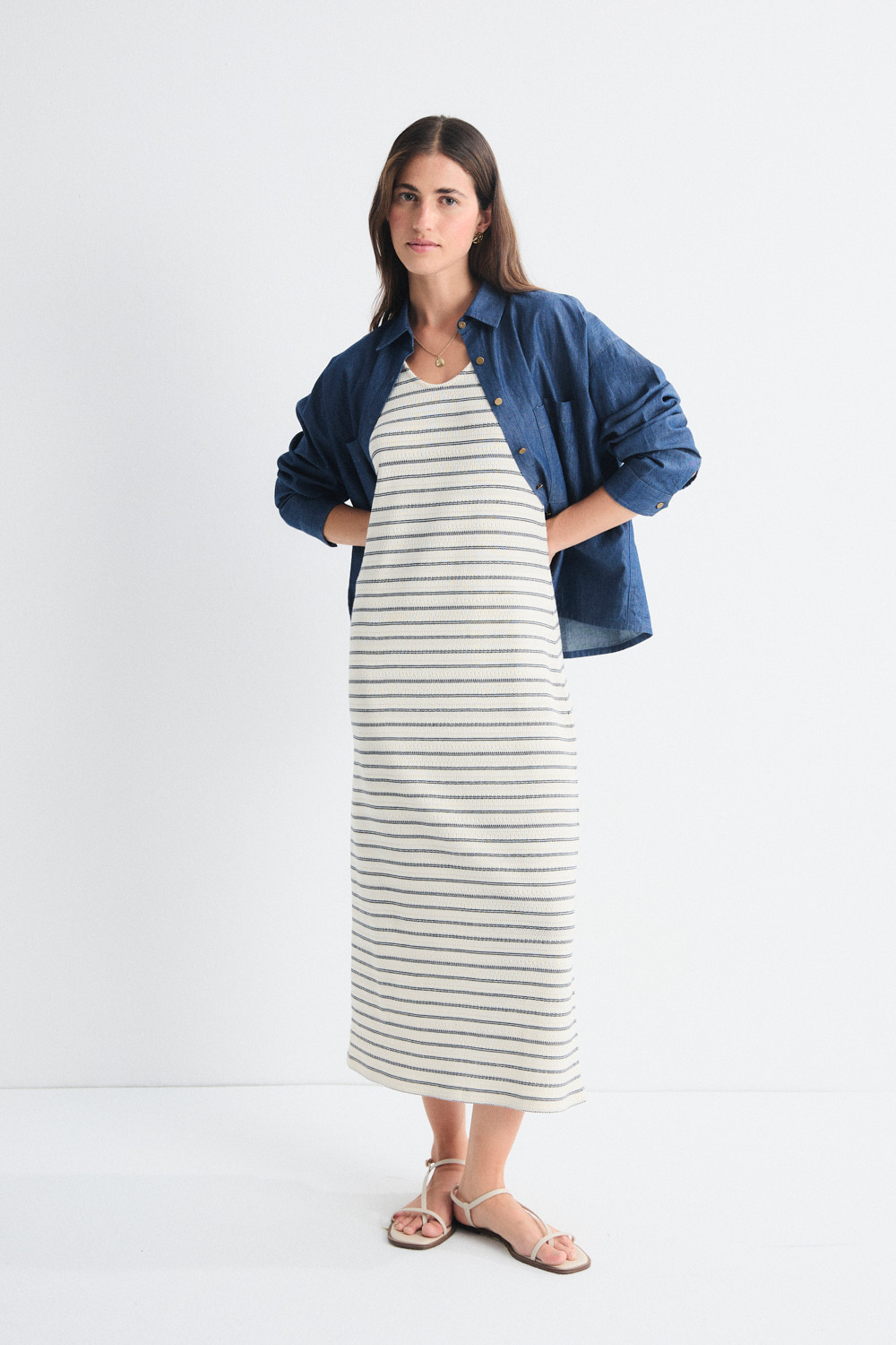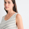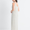 Vestido de tirantes en punto especial a rayas, de silueta cómoda y veraniega. Forma parte de la familia Eliane, junto al top y la falda confeccionados en el mismo tejido.