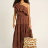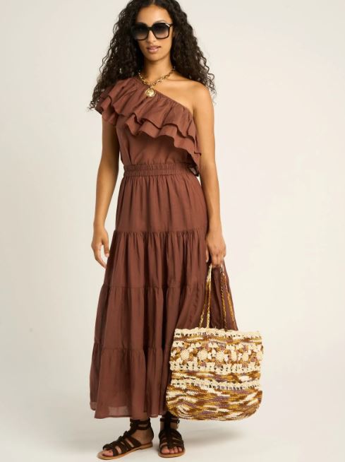 Petite Mendigote top asimétrico timeo brown con volante doble en escote.
