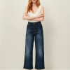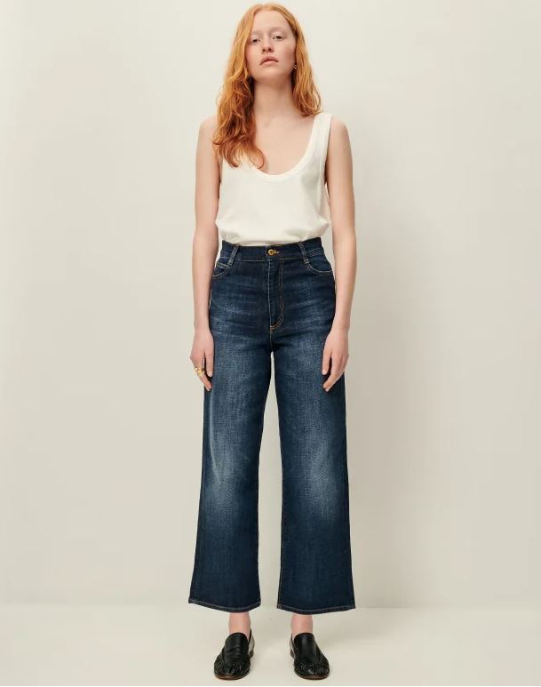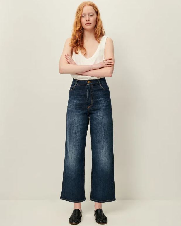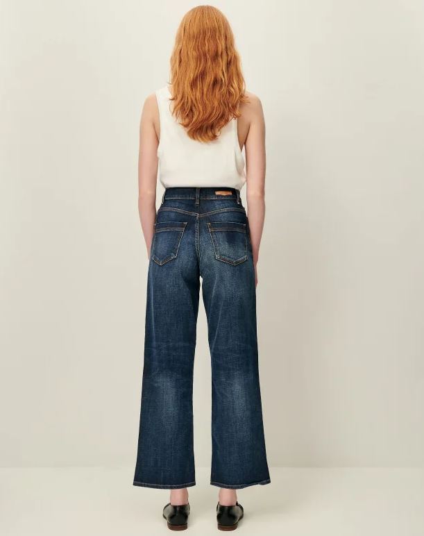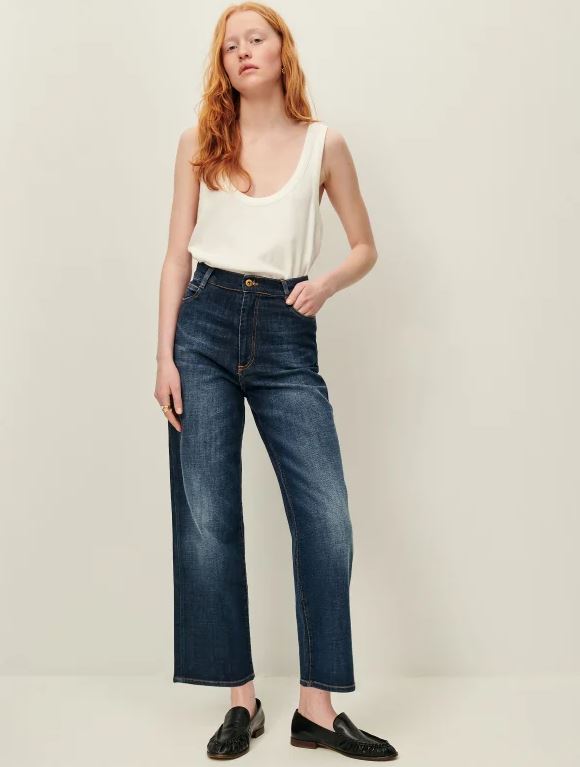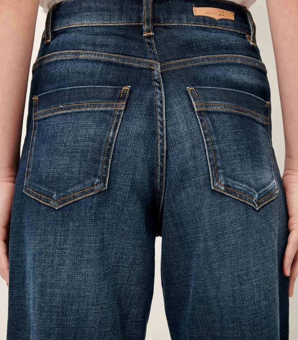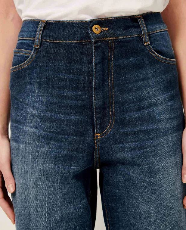 Pantalón vaquero recto de talle alto, con perneras ligeramente amplias, en tejido denim lavado a la piedra.