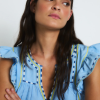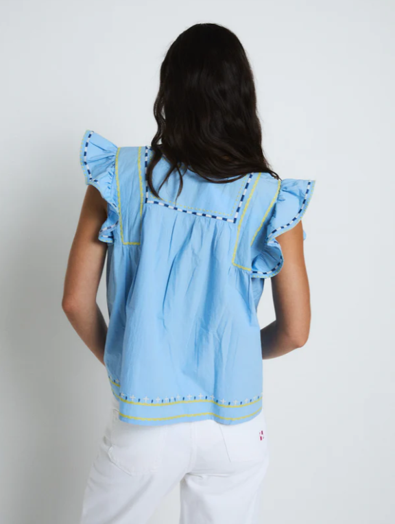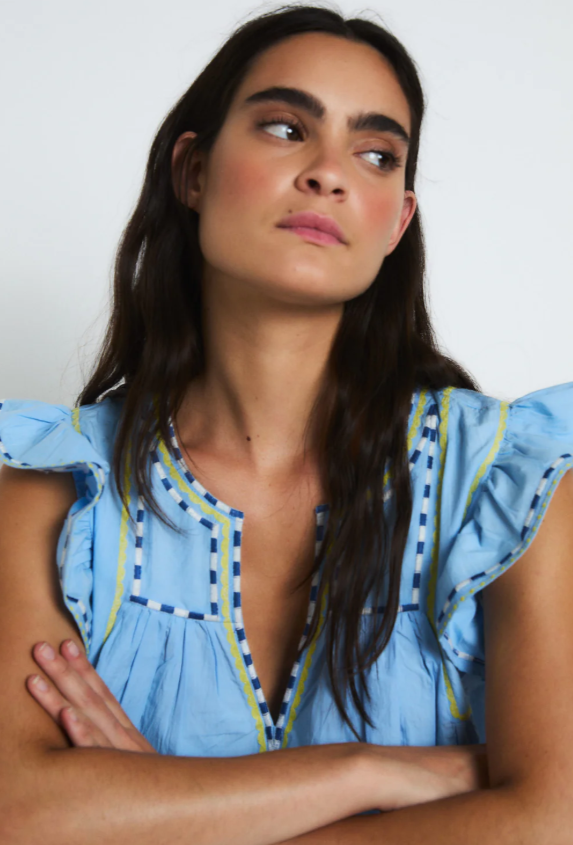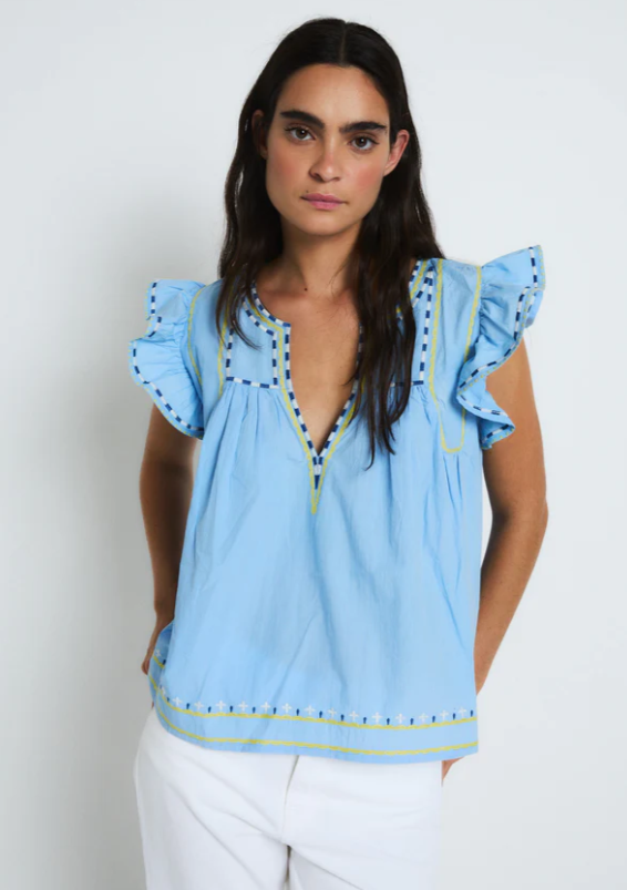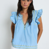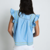 Blusa ligera en tono azul con escote en pico y delicados detalles bordados en contraste. Presenta mangas cortas con volantes que aportan volumen, además de acabados decorativos en el cuello y el bajo.
