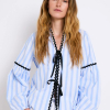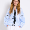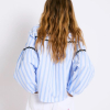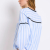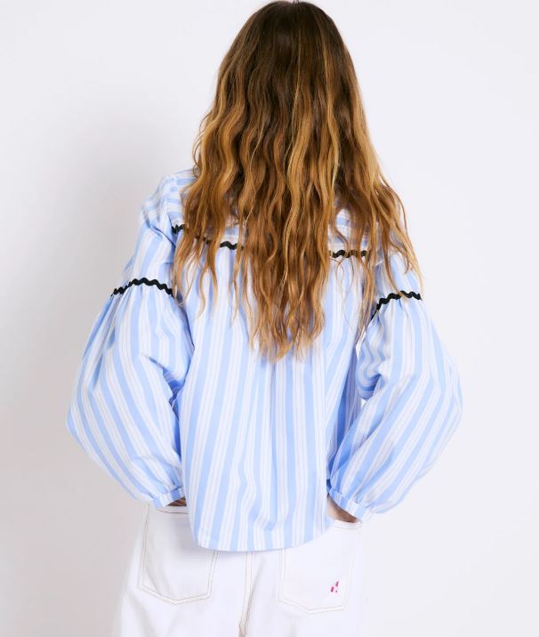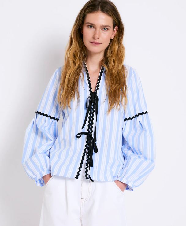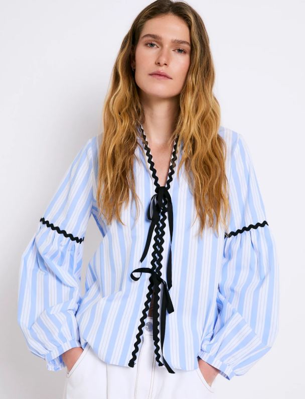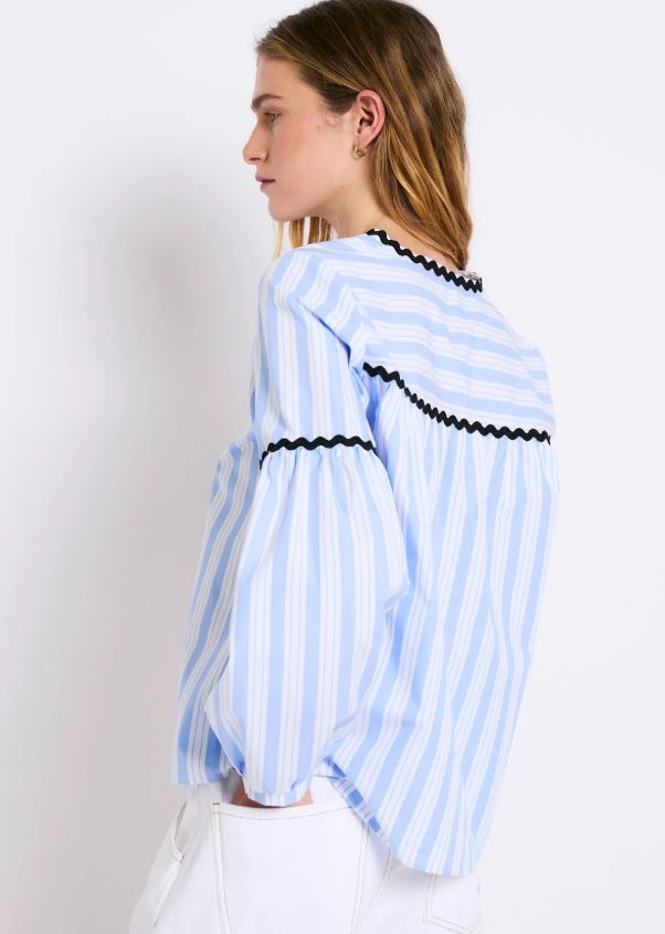 Blusa confeccionada en un tejido de rayas verticales en tonos celeste y blanco. Tiene un diseño amplio con mangas abullonadas y puños fruncidos. Destaca por sus detalles de cinta ondulada negra (tipo zigzag) que recorre el escote en V, las mangas y el cierre frontal, que se ajusta mediante lazos del mismo tono.