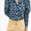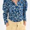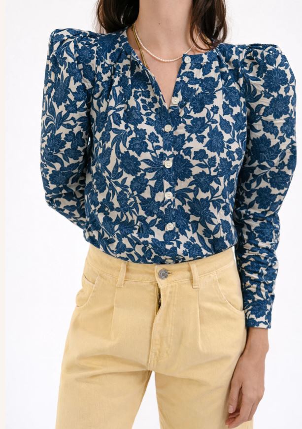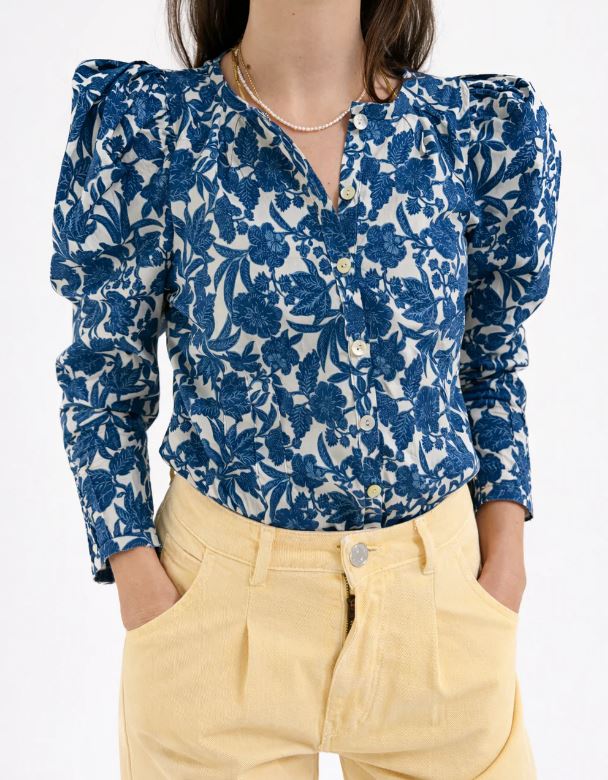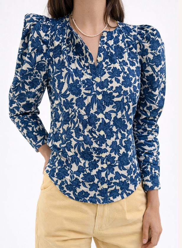 Blusa con estampado floral azul sobre fondo blanco. Entallada a la cintura, lo que resalta la silueta, y presenta hombros ligeramente abullonados que aportan volumen y estructura. Las mangas son largas y el cuello es redondo, con una pequeña abertura central. El cierre es frontal con botones nácar.