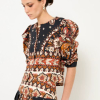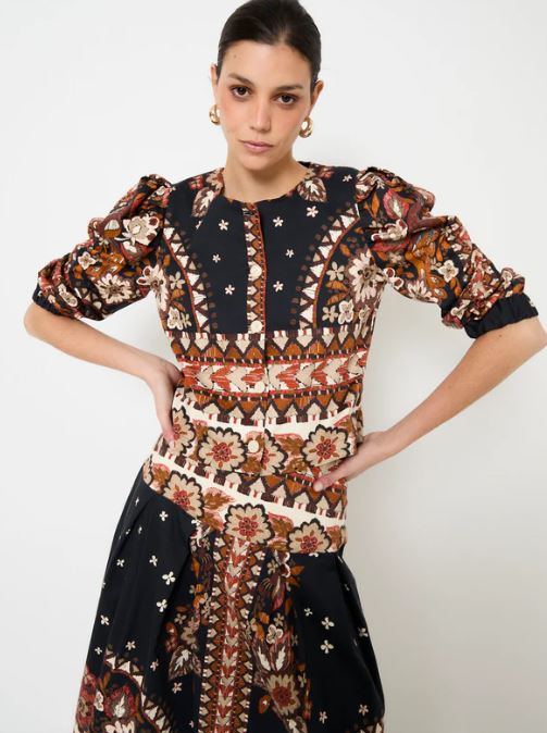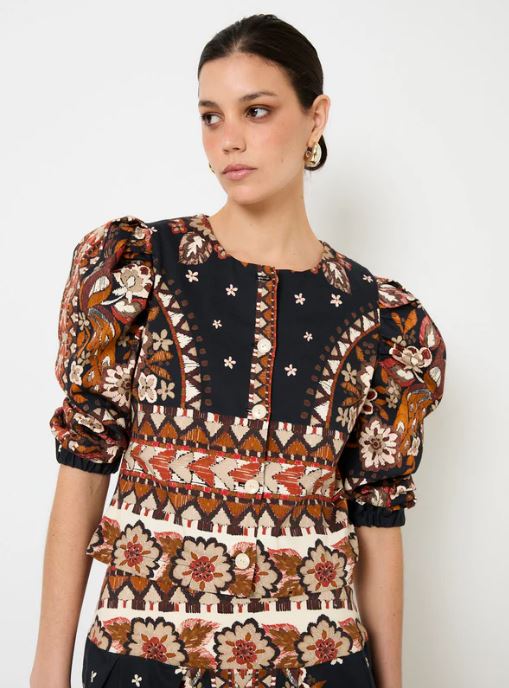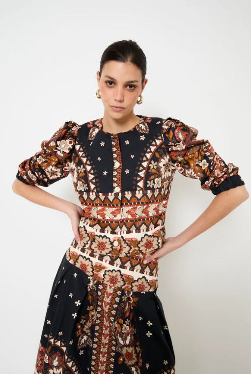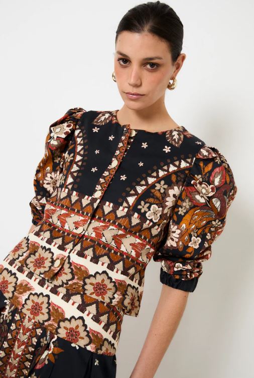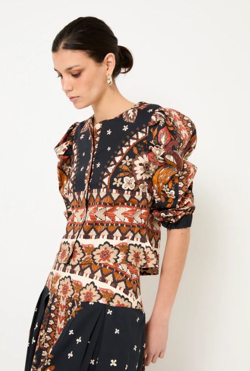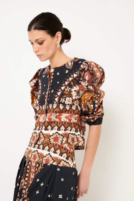Chaqueta corta confeccionada en algodón estampado con dibujo floral en tonos tierra, granate y negro. Presenta manga abullonada, cuello redondo y cierre frontal con botones color crudo. Su estructura entallada realza la silueta. Ideal para combinar con su falda a juego.