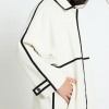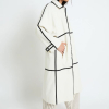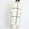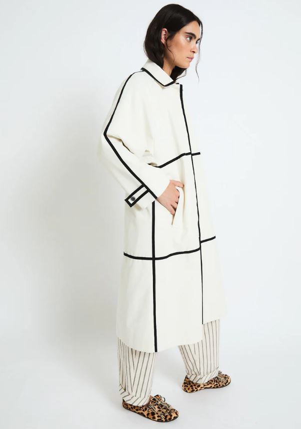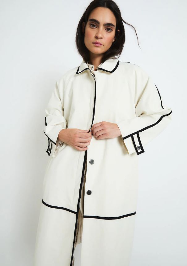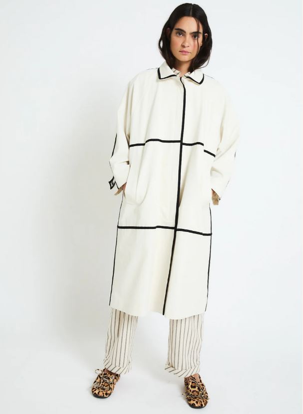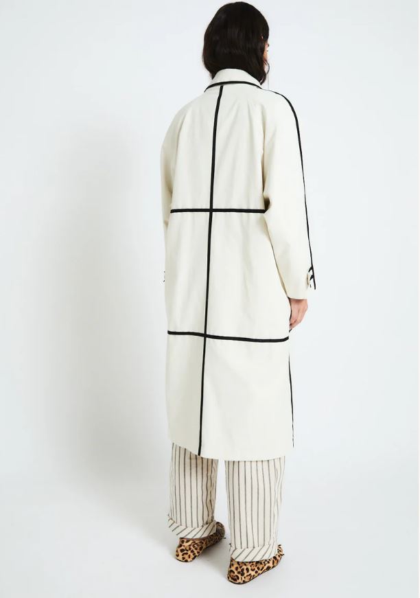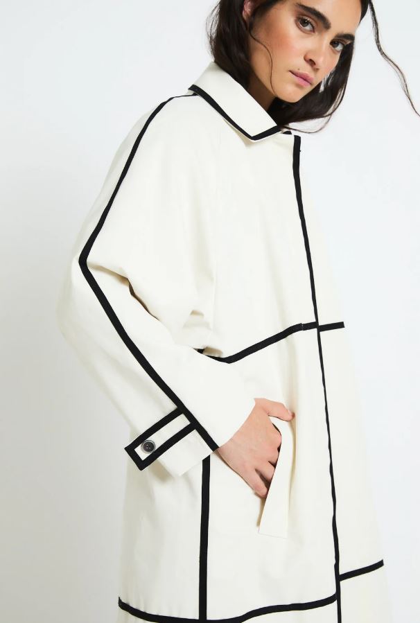 Gabardina recta de color crudo con diseño minimalista realzado por cintas negras que trazan líneas verticales y horizontales.