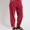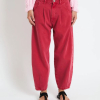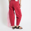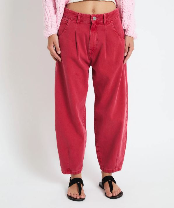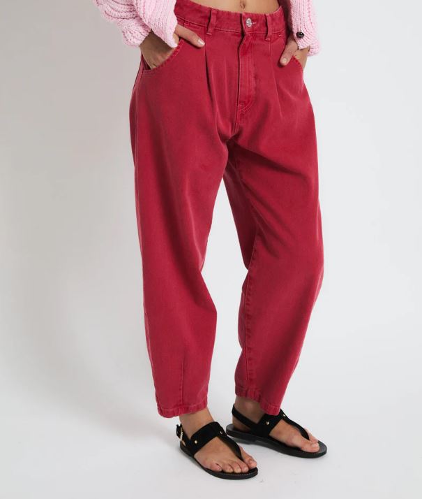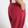Pantalón vaquero color rojo de corte relajado y pinzas delanteras. Tiene bolsillos laterales y cierre de botón y cremallera.