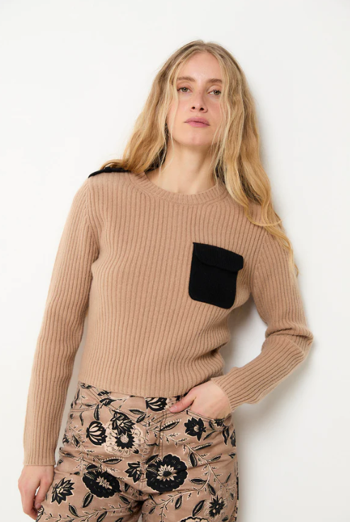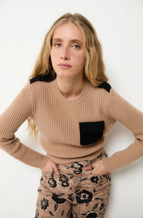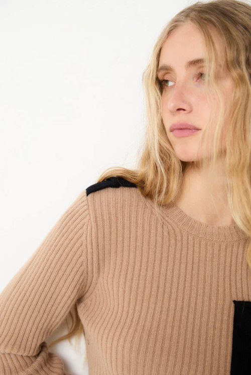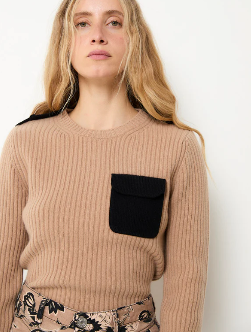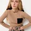 Jersey de punto canalé en color beige con diseño ajustado. Presenta cuello redondo y destaca por su bolsillo de parche en contraste negro en el pecho, así como un detalle también negro en el hombro izquierdo.