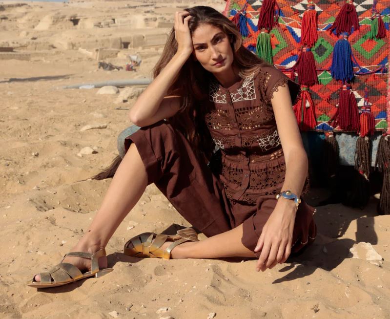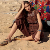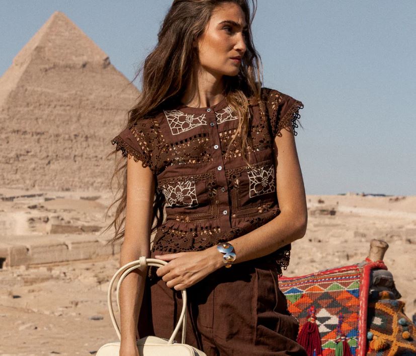 Top en color chocolate con diseño sin mangas y cuello redondeado. Confeccionado con detalles de encaje y bordados que aportan textura. Cierre frontal con botones y acabados delicados.