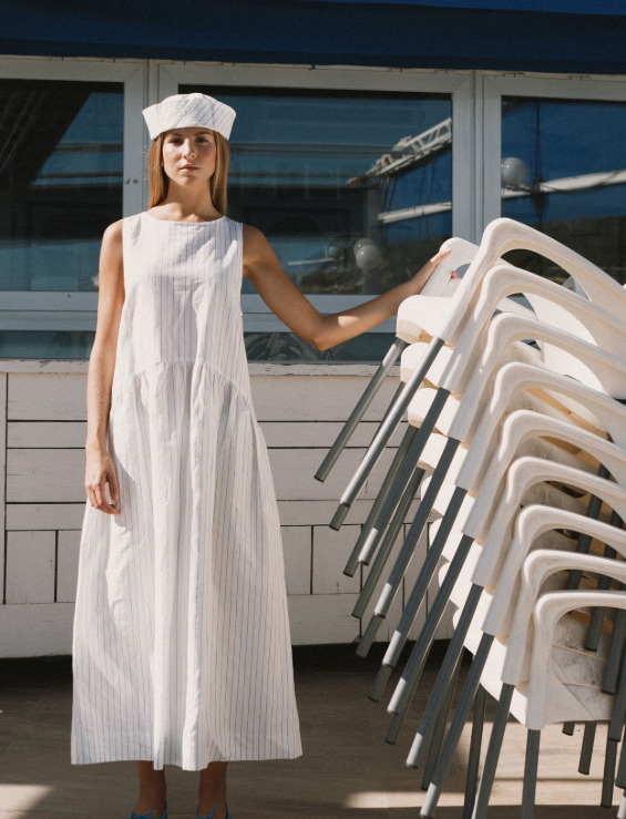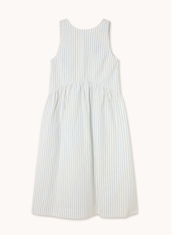 Vestido largo en mezcla de algodón y lino con textura “paper touch” y efecto arrugado. Con base blanca y rayas azul claro, con corte holgado. Presenta escote en la espalda con lazada y falda fruncida con volumen ligero para un aspecto elegante y desenfadado.