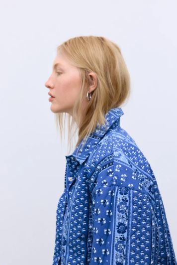 Chaqueta acolchada de algodón diseñada para una comodidad ligera durante la primavera y el verano. Con un cuello camisero clásico y un femenino cierre frontal con lazo, destaca por su hermoso estampado de bandana azul que le aporta carácter y frescura. Con prácticos bolsillos laterales, esta chaqueta es una prenda versátil y fácil de llevar, perfecta para el verano.