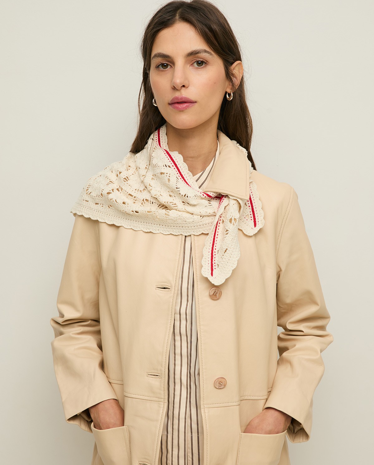 Chal de crochet en color crudo. Diseño en forma triangular. Detalle de vivo a contraste. Medidas: 100×45 cm.