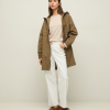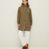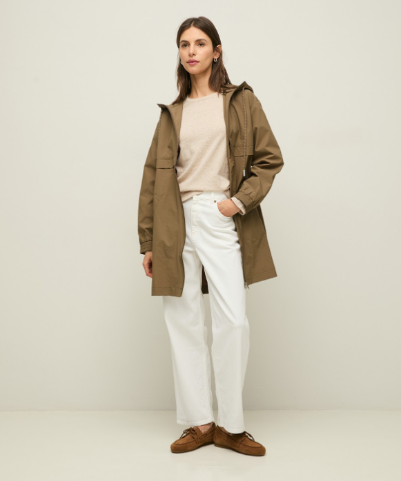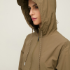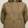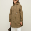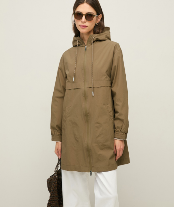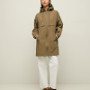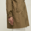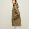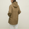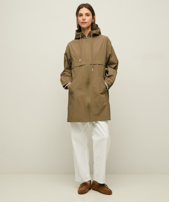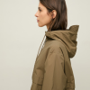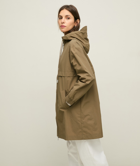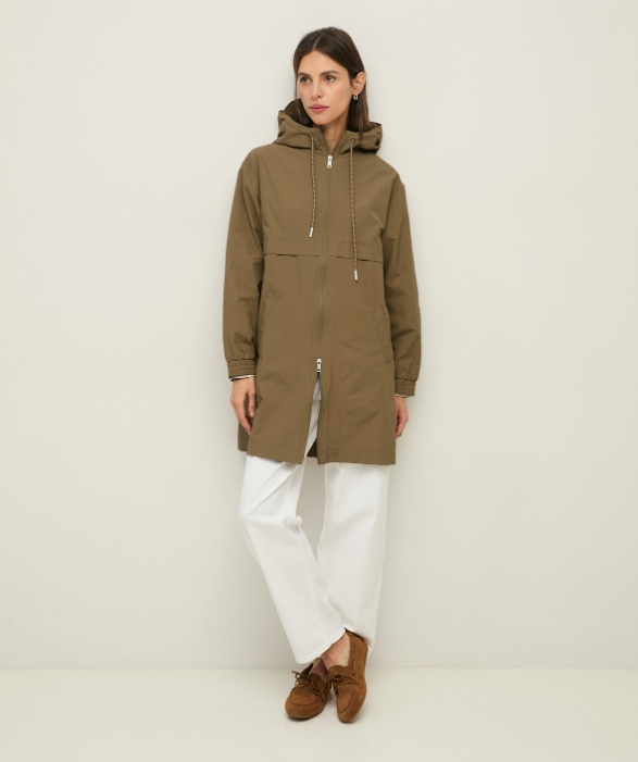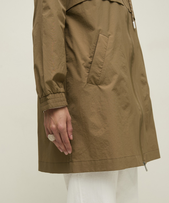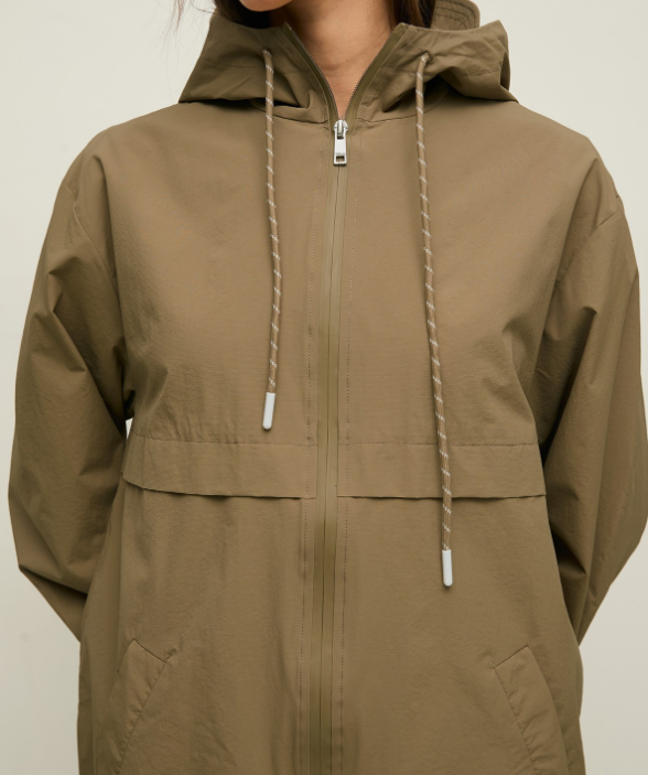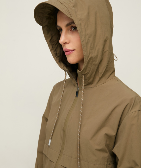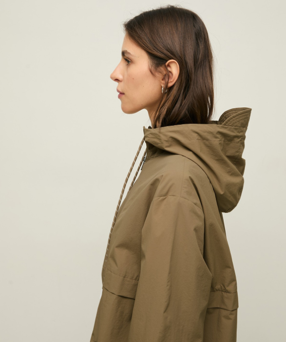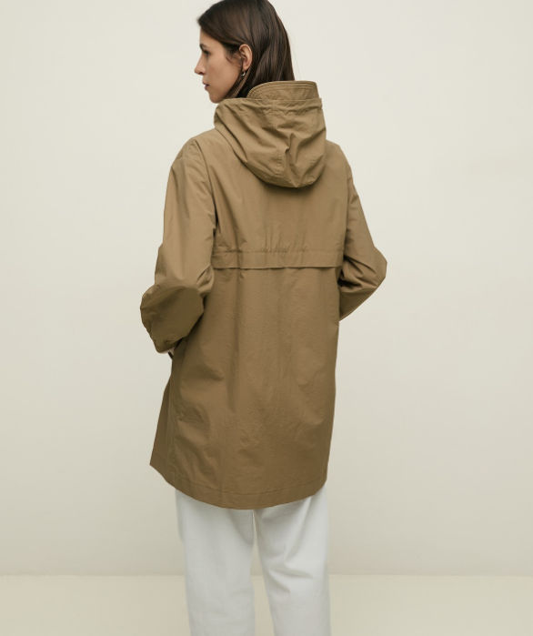 Parka con capucha de color caqui. Tejido ligero elaborado en poliamida y acabado water repellent. Cierre frontal con cremallera doble apertura. Capucha con visera, forro y tiras regulables. Puños elásticos. Dos bolsillos frontales. Largo desde el hombro: 90 cm (talla S).